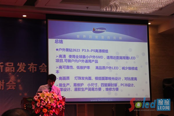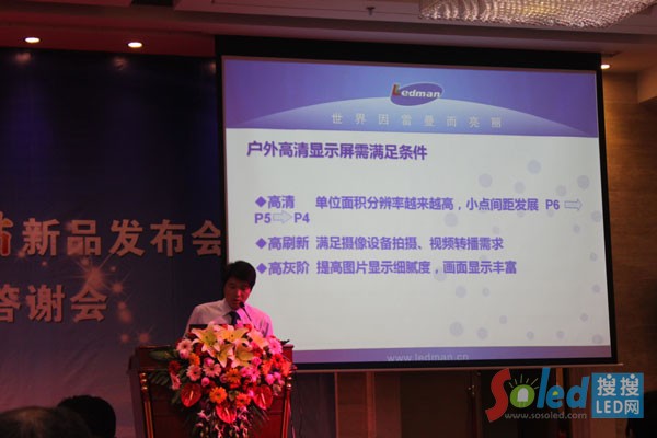 在5月20日舉行的“戶外全彩SMD 2623黑鉆新品發(fā)布會(huì)暨雷曼十周年感恩答謝會(huì)”上,雷曼封裝資深工程師何俊杰先生從應(yīng)用生產(chǎn)方面,介紹了LED顯示屏發(fā)展趨勢(shì),戶外全彩SMD顯示屏的優(yōu)勢(shì),為用戶提供了一系列在生產(chǎn)中用得著的實(shí)用資料。