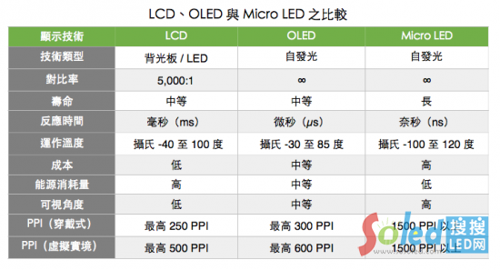 承繼了LED的特性, Micro LED優(yōu)點包括低功耗、高亮度、超高解析度與色彩飽和度、反應(yīng)速度快、超省電、壽命較長、效率較高等,其功率消耗量約為LCD的10%、OLED的50%。而與同樣是自發(fā)光顯示的 OLED 相較之下,亮度比其高30倍,且解析度可達1500PPI(像素密度),相當于Apple Watch采用OLED面板達到300PPI的5倍之多,另外,具有較佳的材料穩(wěn)定性與無影像烙印也是優(yōu)勢之一。