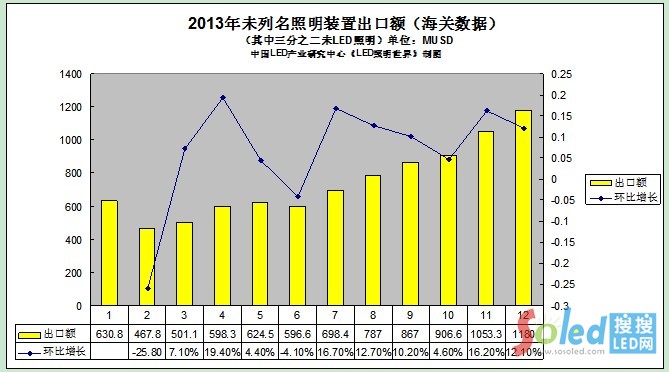 據(jù)海關(guān)數(shù)據(jù)顯示,2013LED照明產(chǎn)品銷售額約660億人民幣,占照明產(chǎn)品銷售額的14%,其中出口60億美元。從出口國(guó)家來看,以美國(guó)和日本為首,其次為歐洲一些國(guó)家。