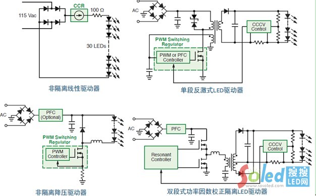 圖1:不同交流主電源供電LED驅(qū)動(dòng)器拓?fù)浣Y(jié)構(gòu)