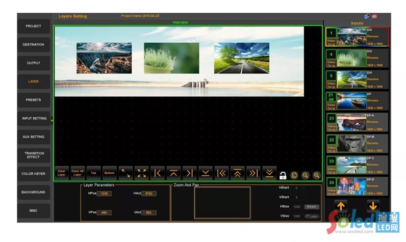 LAYER菜單界面下,通過點(diǎn)擊、拖拽等動(dòng)作,配合控臺(tái)的按鍵,可方便的進(jìn)行圖層大小、位置、ZOOM等參數(shù)的調(diào)節(jié)。