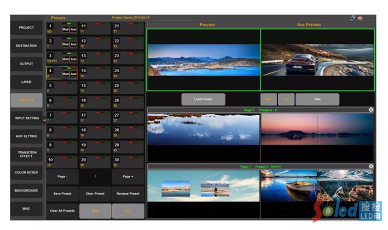 PRESETS菜單界面下,可進(jìn)行預(yù)設(shè)的保存及調(diào)用,包括主輸出的Preview以及輔助輸出的Preview;除此之外,提供2個(gè)預(yù)設(shè)的Livepreview區(qū)域,可直接將預(yù)設(shè)拖拽放入該區(qū)域內(nèi),進(jìn)行監(jiān)視