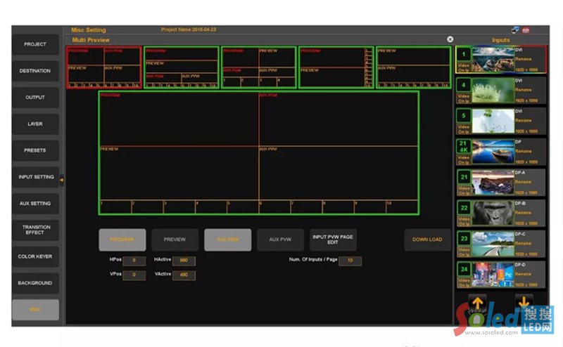 針對(duì)于V8、V6主機(jī)的多預(yù)監(jiān)輸出,控臺(tái)MISC菜單界面內(nèi)的 AUXpreview界面內(nèi),有主輸出、主輸出的預(yù)監(jiān)、輔助輸出、輔助輸出的預(yù)監(jiān)、輸入信號(hào)共5個(gè)基本模塊,用戶可自行設(shè)定每個(gè)模塊的大小、位置,打開或者關(guān)閉,從而實(shí)現(xiàn)多預(yù)監(jiān)的自定義布局,除此之外,提供4種固定的布局方式,供用戶快速選擇;