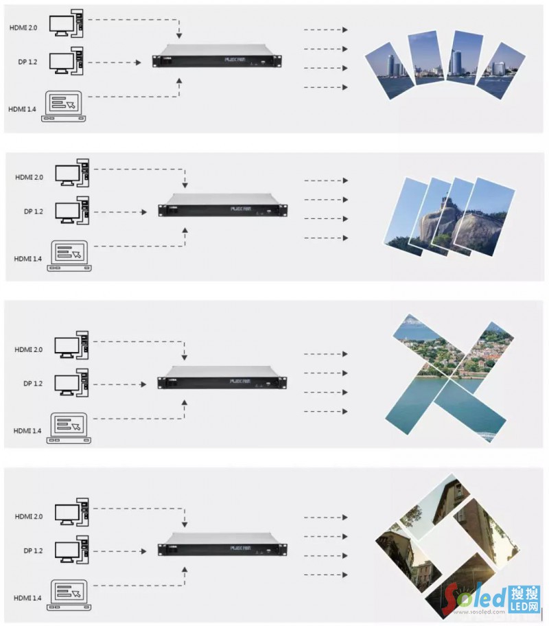 FLEX RS1的四個輸出均可以獨立顯示相同或不同畫面,且針對任意輸出口做圖層的縮放、裁剪、圖像設(shè)置,滿足現(xiàn)場不同顯示設(shè)備的顯示需求。