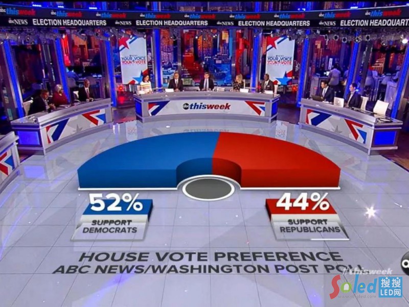 11月6日晚上8點,ABC新聞在定制的360°圓形演播廳中,結(jié)合AR技術(shù)為觀眾報道2018年美國中期選舉。美國中期選舉是在美國四年一屆的總統(tǒng)任期中間,也就是任期第二年的11月,在沒有總統(tǒng)選舉情況下進行的定期選舉,選舉內(nèi)容包括選出435個美國眾議院全部席位、改選參議員約1/3席位等。