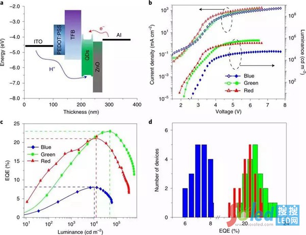 兼具高亮度高效率和長壽命紅綠藍三基色QLED器件問世