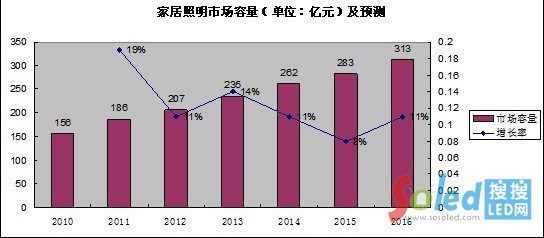 近年來,我國家居照明行業(yè)在持續(xù)、快速、穩(wěn)定發(fā)展,2011年,中國家居照明市場(chǎng)達(dá)到186億元。隨著消費(fèi)結(jié)構(gòu)的不斷升級(jí),人們?cè)絹碓街匾暭揖訜麸椀倪x配,預(yù)計(jì)2016年,我國家居照明市場(chǎng)容量將達(dá)到313億元。 LED 燈具目前在家居照明市場(chǎng)推廣緩慢的主要原因之一是較高的產(chǎn)品價(jià)格。因此降低LED 制造成本成為LED 照明產(chǎn)品能否替代其他家居照明節(jié)能產(chǎn)品的關(guān)鍵。據(jù)美國能源部測(cè)算,至2020年LED 芯片及封裝成本較2012年將減少80% ,同時(shí)發(fā)光效率增加60%到100%。因此, 如果LED 燈具成本下降幅度能達(dá)預(yù)期,家居照明需求將進(jìn)一步釋放,LED 照明行業(yè)將進(jìn)入加速發(fā)展階段。
