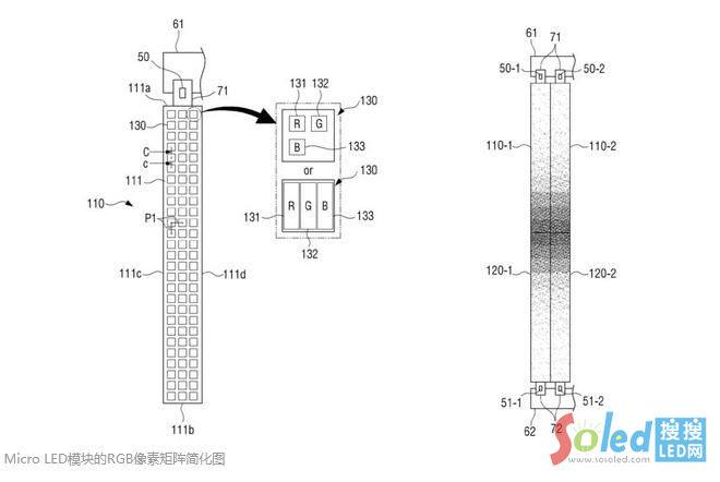 該模塊由數(shù)百個(gè)Micro LED像素組成,每個(gè)像素又分為紅、綠、藍(lán)子像素。子像素在像素中的排布暫時(shí)不清楚,可能是排布成三角形,也可能是拉長(zhǎng)的子像素相鄰排列。專(zhuān)利中提到了顯示器的分辨率。按照常規(guī)格式16:9,分辨率為3,840 x 2,160,即4K超高清。隨著像素密度的增加,8K (7,680 x 4,320)也是可能實(shí)現(xiàn)的。