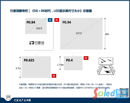 除此之外,LED顯示產(chǎn)品若要取代LCD、投影成為室內(nèi)應(yīng)用的8K顯示主流,P0.4(點(diǎn)間距)是比較適合的(屏高1.73米,約一個(gè)人身高);若結(jié)合“會(huì)議+5G+8K”的三個(gè)要素,LED顯示屏間距微縮至0.4mm將是必然的趨勢(shì),而這正是Micro LED顯示的主戰(zhàn)場(chǎng)。