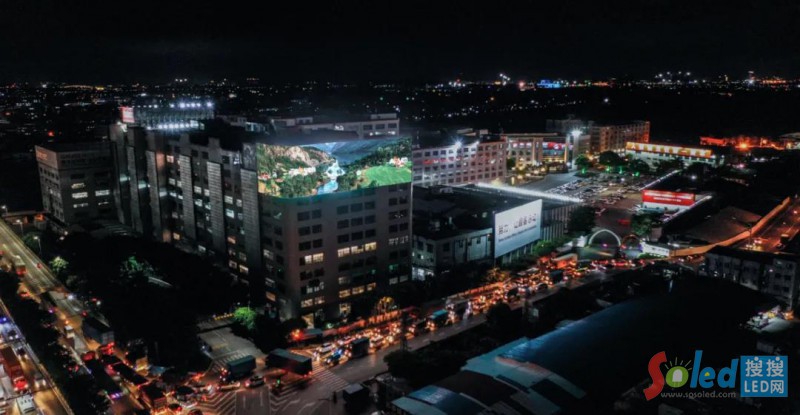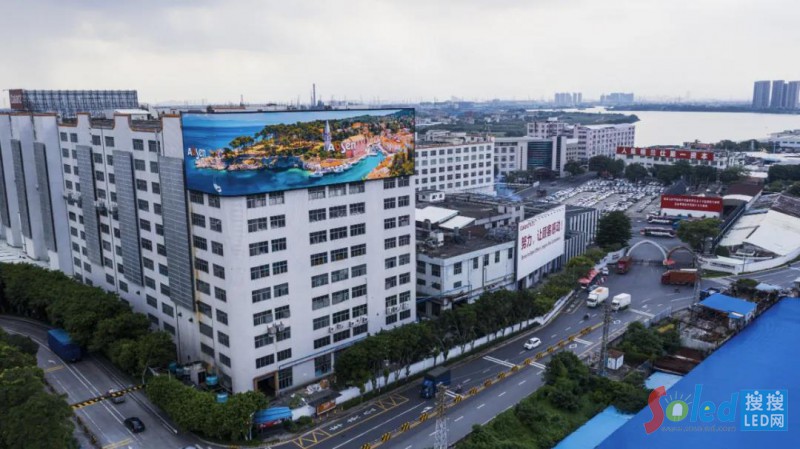 2020年9月,在格蘭仕順德總部,一棟大樓外圍頂部完成了最新的樓面設(shè)計,L型曲面巨型LED顯示屏全面點亮,奪目鮮艷的顯示畫面,為沉寂的工業(yè)區(qū)喚醒了新的生命力。