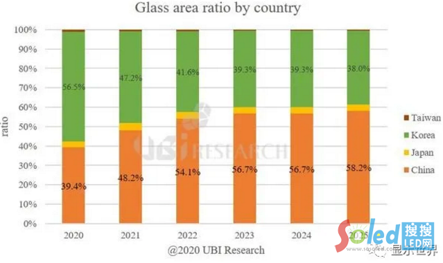 因此,在今年之前,韓國的量產(chǎn)基板面積為56.5%,但從2021年開始,中國的量產(chǎn)能力有望達(dá)到1%,但是產(chǎn)能比例正在快速逆轉(zhuǎn),預(yù)計(jì)2022年之后,中國的量產(chǎn)能力將有望超過50%。