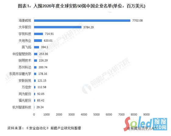 根據(jù)全球知名的科技媒體Automation Security《安全自動化》發(fā)布的2020年度全球安防50強(qiáng)榜單。有四家中國企業(yè)入選TOP10,分別為海康威視、大華股份、宇視科技、天地偉業(yè)。海康威視及大華股份仍以77億美元和38億美元的營收數(shù)據(jù)穩(wěn)居全球第 一與第二的位置。
