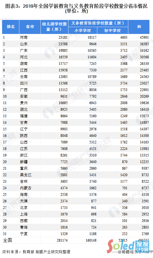 根據(jù)教育部數(shù)據(jù)可知,2019年全國學(xué)前教育與義務(wù)教育階段學(xué)校數(shù)量分省市排名情況中,河南、山東、廣東、河北、湖南、江西、云南、四川、廣西、安徽為數(shù)量排名前十省份,河南省以45901所為全國學(xué)前教育與義務(wù)教育階段學(xué)校數(shù)量總和之首,西藏、青海、寧夏學(xué)前教育與義務(wù)教育階段學(xué)校數(shù)量相對較少。