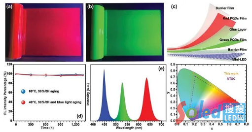 最近,團(tuán)隊(duì)的博士后李飛博士突破了困擾鈣鈦礦量子點(diǎn)背光顯示應(yīng)用的紅光缺失難題,發(fā)展了聚合物基質(zhì)中的紅色全無(wú)機(jī)鈣鈦礦量子點(diǎn)的原位制備技術(shù),發(fā)光效率和穩(wěn)定性都十分優(yōu)異( Advanced  Functional Materials 2021, 2008211)。通過(guò)致晶科技公司的進(jìn)一步開發(fā),實(shí)現(xiàn)了鈣鈦礦量子點(diǎn)Micro-LED背光模組,獲得2020年中國(guó)國(guó)際顯示技術(shù)(ICDT)會(huì)議新產(chǎn)品銀獎(jiǎng)。