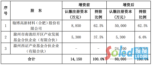 同時,為了推進該項目,翰博高新、滁州西證產(chǎn)業(yè)基金合伙企業(yè)(有限合伙)(滁州南譙經(jīng)濟開發(fā)區(qū)管理委員會確定的投資人)擬以貨幣方式向滁州博晶進行增資,增資情況如下: