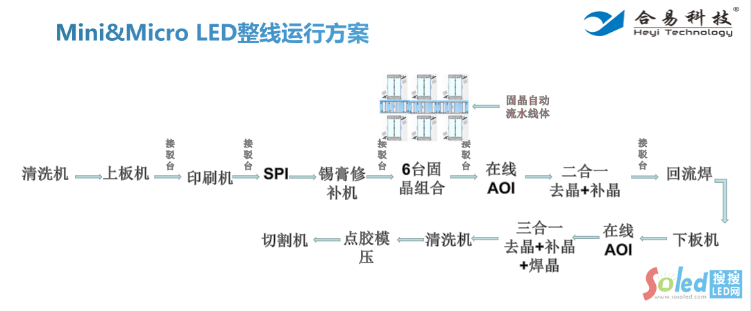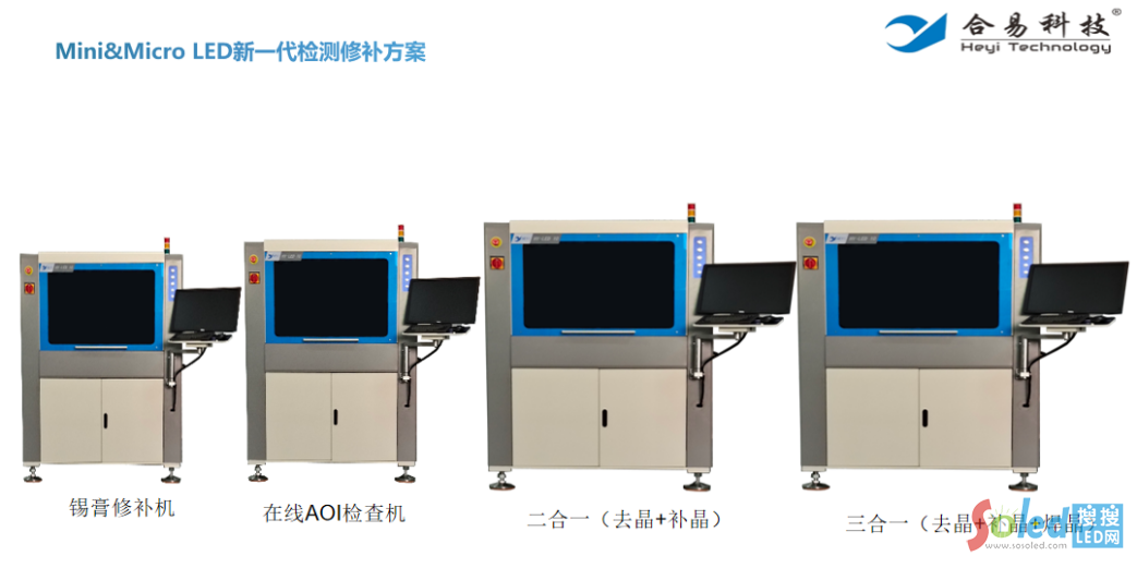 合易科技全自動智能Mini&Micro Led檢修解決方案核心設(shè)備為在線錫膏修補(bǔ)機(jī)、在線AOI 外觀點(diǎn)亮檢測機(jī)、在線去晶+補(bǔ)晶二合一設(shè)備、在線去晶+補(bǔ)晶+焊晶三合一設(shè)備。