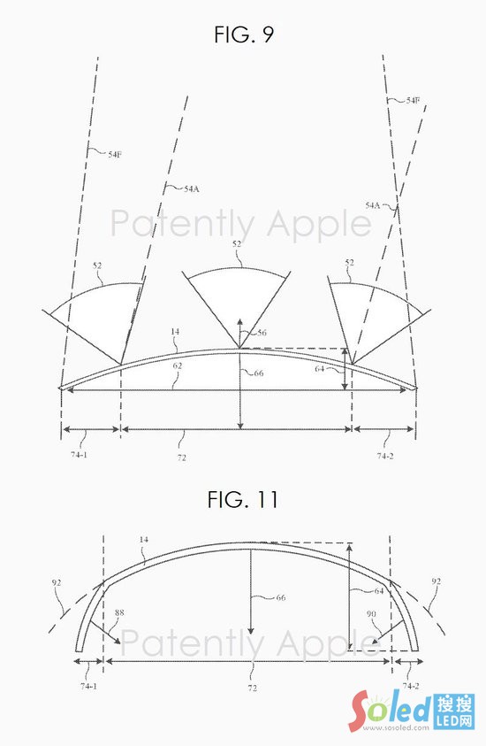 蘋(píng)果專(zhuān)利圖 11 示出了示例性曲面光柵顯示屏的橫截面?zhèn)纫晥D,該顯示器在非立體區(qū)域中具有與在立體區(qū)域中不同的曲率半徑。