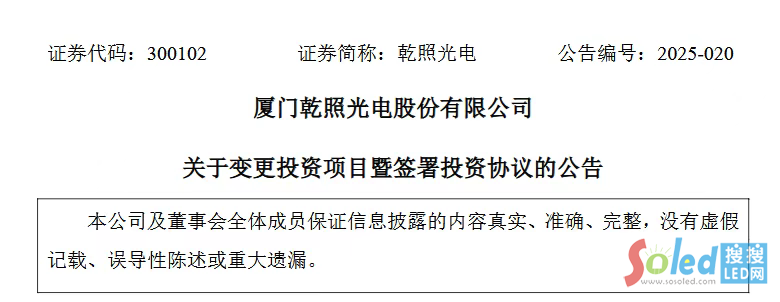 3月26日,乾照光電發(fā)布公告,宣布變更投資項(xiàng)目并簽署投資協(xié)議。