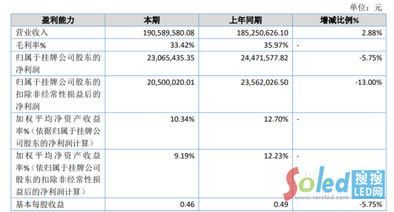 報告期內(nèi),公司實現(xiàn)營業(yè)收入 19,058.96 萬元,比上年同期增加 2.88%;營業(yè)利潤 2,590.37萬元,比上年同期減少 11.45%;歸屬于公司股東的凈利潤 2,306.54 萬元,比上年同期減少 5.75%;基本每股收益為 0.46 元,比上年同期減少 5.75%。
