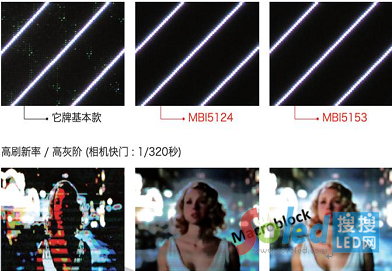 聚積科技策略產(chǎn)品營銷總監(jiān)邱奕翔談到此次路升所發(fā)表的新品是使用聚積MBI5153以及MBI5124(見圖五顯示效果比較圖),相對于其他市面上的驅(qū)動芯片,具有以下特色: