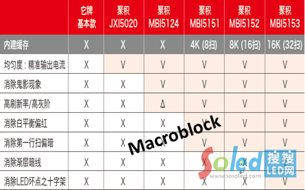 表一、聚積小點(diǎn)間距驅(qū)動芯片方案比較表,MBI5153具所有必備功能