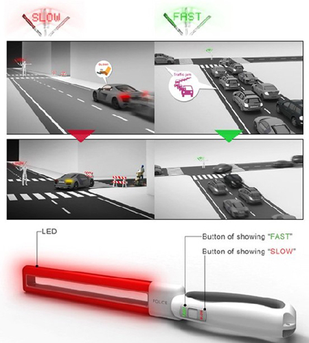 正如它名字說所得,它可以顯示文字,當交警用力揮舞指揮棒的時候,就會在空中顯示紅色的“快”或者綠色的“慢”字,這樣能夠更好的吸引司機的注意力,交警的工作也能更好的進行。