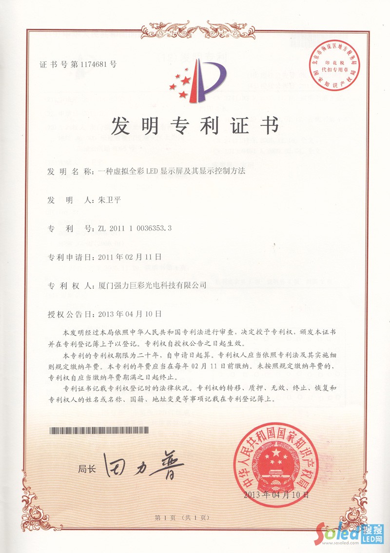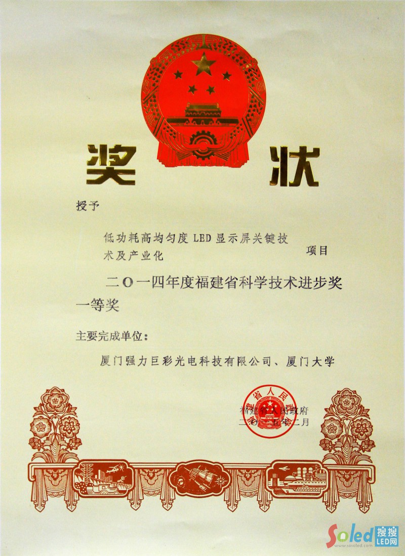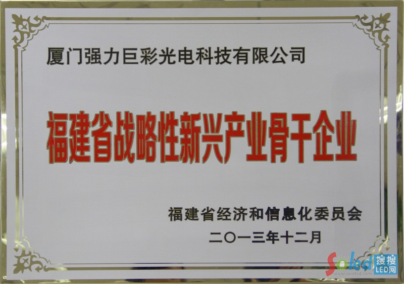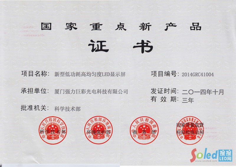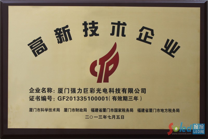 正因為在LED技術研發(fā)領域的不斷努力,強力巨彩獲得國家重點新產品、福建省科技進步一等獎等科技獎項。并主導修訂福建省地方標準《LED顯示屏通用規(guī)范》,參與制定中國質量認證中心《中國LED顯示屏節(jié)能認證實施規(guī)則》。目前強力巨彩擁有專利110多項,被確定為省知識產權優(yōu)勢企業(yè)、廈門市創(chuàng)新型企業(yè)和廈門市技術進步先進工業(yè)企業(yè)。同時強力巨彩也是廈門市唯一一家經認定的LED顯示屏工程技術研究中心,可作為對外提供研發(fā)、檢測、技術交流的公共服務平臺。