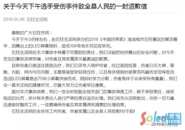 作為承辦方之一的《石柱生活網》在其官方微信公眾號上發(fā)布了《關于今天下午選手受傷事件致全縣人民的一封道歉信》,證實《中國好聲音》106好選手劉見容因舞臺LED屏幕倒塌受傷;傷者已被送往醫(yī)院治療,單位也已派專人陪護傷者,經過醫(yī)院檢查,傷者已無大礙,主要是背部受輕微撞擊,下顎受傷,牙齒受損。