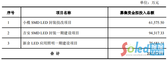 公告顯示,木林森本次非公開發(fā)行扣除發(fā)行費用后的募集資金凈額不超過231,573.94萬元,募集資金將全部用于小欖SMD LED封裝技改目、吉安SMD LED封裝一期建設、新余LED應用照明一期建設三大項目,分別擬投入總額61,575.50萬元、94,317.33萬元、75,681.11萬元。