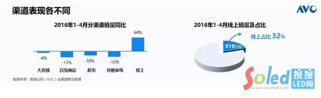 從渠道方面,今年1到4月份線上的增長(zhǎng)64%,這是一個(gè)同比的數(shù)據(jù),在線下各類的賣場(chǎng)都呈現(xiàn)了不同程度的下跌,其中大連鎖,由于它的規(guī)模優(yōu)勢(shì)以及它的快速應(yīng)變,僅僅以4%的幅度下跌,百貨商店、超市和其他商店呈現(xiàn)了10%以上的下跌。絕對(duì)值來(lái)看,1到4月份,線上銷量519萬(wàn)臺(tái),占到了全渠道的32%,預(yù)計(jì)今年全年線上的占比將達(dá)到34%,同樣也是一個(gè)非常好的數(shù)字,這樣一個(gè)線上的占比主要取決于部分品牌官網(wǎng)的增長(zhǎng),而公共的電商平臺(tái)的增長(zhǎng)正在放緩,換句話說(shuō),公共平臺(tái)的電商正在和線下形成一種平衡。我們從京東、國(guó)美在線、阿里等等這些電商在向線下拓展的趨勢(shì)能夠看到,我們電商的人口紅利正在消化殆盡,電商或者一些互聯(lián)網(wǎng)廠商他們也非常急切的想占有線下的資源,一方面是占有線下形態(tài)各異的消費(fèi)場(chǎng)景,另外一方面,對(duì)線下供應(yīng)鏈的能力表現(xiàn)了急切的渴望,未來(lái)一段時(shí)間內(nèi),線上+線下的消費(fèi)場(chǎng)景+線下的商品以及線下的物流配送,這樣一個(gè)O2O的閉環(huán)場(chǎng)景成為彩電行業(yè)的標(biāo)準(zhǔn)雛形。