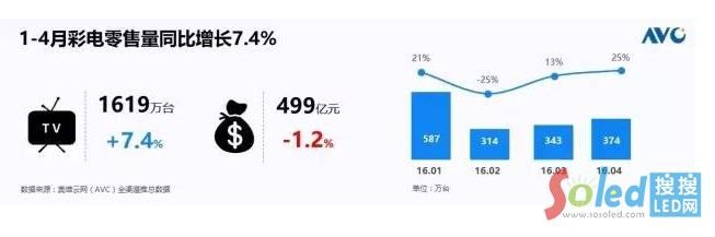 大家下午好,接下來(lái)20分鐘的時(shí)間,我們奧維云網(wǎng)針對(duì)大屏顯示現(xiàn)狀以及未來(lái)發(fā)展做一個(gè)介紹,1到4月份彩電零售量達(dá)到了1619萬(wàn)臺(tái),同比增長(zhǎng)7.4%,1到4月份的銷售額是499億元,同比下降1.2%,大家會(huì)發(fā)現(xiàn)兩個(gè)細(xì)節(jié),第一個(gè)細(xì)節(jié),整個(gè)市場(chǎng)的容量方面是景氣的、上升的,實(shí)際上臺(tái)下坐著很多廠商的朋友,并沒(méi)有感覺到我們這個(gè)市場(chǎng)的暖意或者說(shuō)并沒(méi)有享受到這份暖意,有一些我們之前不曾關(guān)注到的品牌,正在悄悄的生長(zhǎng)。第二個(gè)細(xì)節(jié),從銷量和銷額的趨勢(shì)差異化可以看到,這個(gè)行業(yè)平均價(jià)格正在快速的下滑。1到4月份銷量除了2月份下降之外,1月份、3月份、4月份同比上升都在10個(gè)點(diǎn)之上。