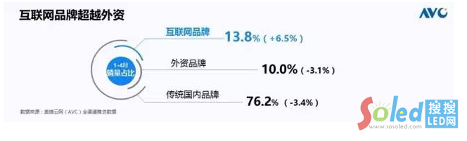 對(duì)于市場(chǎng)格局的判斷,我們奧維傾向于認(rèn)為未來(lái)的彩電市場(chǎng)的大盤式增長(zhǎng)正在向競(jìng)爭(zhēng)性增長(zhǎng)來(lái)進(jìn)行分化,我們以互聯(lián)網(wǎng)品牌為例,1到4月份已經(jīng)超過(guò)了外資品牌,達(dá)到了13.8%的市場(chǎng)份額。之前我們講的中、日、韓三國(guó)殺的局面將逐漸的被傳統(tǒng)品牌和互聯(lián)網(wǎng)品牌的雙雄戰(zhàn)來(lái)代替。我們認(rèn)為在今年品牌格局發(fā)生洗牌將會(huì)是大概率事件,創(chuàng)維、海信領(lǐng)袖品牌大者很大、強(qiáng)者很強(qiáng),像小的二線品牌可能會(huì)放棄抵抗,比較體面的離場(chǎng)。