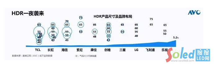 當(dāng)下最火的是HDR技術(shù),從拍攝、傳輸、接收、解碼、顯示所有的環(huán)節(jié)的一個(gè)協(xié)同合作,使得我們能夠得到較高的對(duì)比度,使得我們能夠還原真實(shí)的畫質(zhì)細(xì)節(jié)。當(dāng)我們很多的老百姓還在百度什么叫HDR的時(shí)候,這個(gè)HDR電視已經(jīng)如春風(fēng)一樣一夜襲來(lái),剛剛過(guò)去的五一市場(chǎng),HDR占到5.2%的市場(chǎng)滲透率。這幅圖展現(xiàn)了一下每個(gè)品牌對(duì)HDR電視的產(chǎn)品布局,可以看到,HDR被大范圍推廣,已經(jīng)在全品牌、全尺寸實(shí)現(xiàn)了覆蓋。在未來(lái),HDR是否能夠成為我們這個(gè)行業(yè)的錦上添花,我想可能還要關(guān)注到我們HDR行業(yè)的規(guī)范。剛才跟協(xié)會(huì)領(lǐng)導(dǎo)聊天,7月份的時(shí)候,協(xié)會(huì)主辦的季度彩電發(fā)布會(huì)上面,我們也是會(huì)發(fā)布這個(gè)行業(yè)的HDR電視標(biāo)準(zhǔn),也請(qǐng)大家多多關(guān)注。