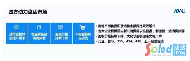 我們認(rèn)為有四方面的力量正在盤活這個(gè)市場(chǎng),第一個(gè)力量,政策寬松釋放了房地產(chǎn)的需求,同時(shí)帶動(dòng)了家電的需求,1到4月份,中國(guó)房地產(chǎn)的銷售面積同比上漲35.9%,銷售額同比上漲56%;第二個(gè)力量,各個(gè)品牌,新品高調(diào)頻發(fā),我個(gè)人有一個(gè)統(tǒng)計(jì),3月份電視行業(yè)大概有11個(gè)發(fā)布會(huì)在進(jìn)行,如果把手機(jī)加上的話,會(huì)超過(guò)30個(gè)發(fā)布會(huì);第三個(gè)力量,面板的價(jià)格持續(xù)下降,尤其是大尺寸,在去年的一年里,幾乎所有的尺寸面板呈現(xiàn)的是單邊下降的態(tài)勢(shì),在今年的1到4月份,我們的大尺寸或者說(shuō)超大尺寸,延續(xù)了之前的一個(gè)慣性的下降,基本上都在10%以上的下跌幅度;第四個(gè)力量,不間斷的持續(xù)的促銷戰(zhàn),廠商雖然很疲憊,但是還要來(lái)跟進(jìn),這些持續(xù)的促銷戰(zhàn)對(duì)這個(gè)市場(chǎng)起到了一些增量的作用。