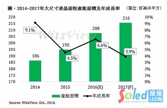TrendForce 旗下光電事業(yè)處 WitsView 最新大尺寸液晶面板產(chǎn)能調(diào)查報告顯示,2016 上半年受南臺灣地震及三星制程轉(zhuǎn)換不順等沖擊,全球大尺寸面板產(chǎn)能面積約 2.08 億平方米,年成長率 6.6%,預(yù)估 2017 年投入面積微幅提升至 2.16 億平方米,年成長率僅 3.9%,將是自 2014 年來產(chǎn)能增加最保守的一年。