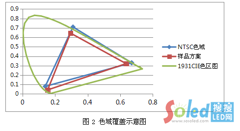 結合色域覆蓋率的概念,可以推出NTSC色域就是某一RGB三基色坐標組成的三角形區(qū)域與NTSC標準RGB三個色坐標組成的三角形區(qū)域的比值(示意圖如圖2),比值越高,色彩的表現力越好。