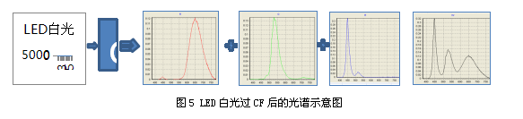 LED白光經過CF后得到另一個新的白光光譜,此新的白光實際是由3個獨立R、G、B光譜構成,詳細的過程如下圖: