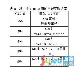 已知NTSC色域是NTSC標準下某個三角形區(qū)域與標準三角形區(qū)域的比值,比值越高,色彩的表現力越好,而業(yè)內常說的高色域覆蓋率則指的是NTSC色域比值≥85%,下表3為常用的不同NTSC值的白光實現方式。
