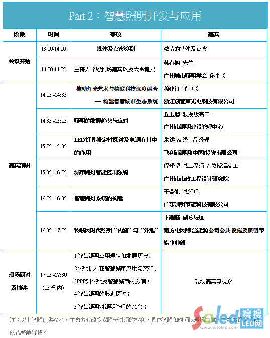 Part2,將以照明在智慧城市的開發(fā)應(yīng)用為切入點(diǎn),對(duì)LED照明進(jìn)行市場(chǎng)與政策分析、效果與應(yīng)用評(píng)估、技術(shù)與產(chǎn)品研討,為L(zhǎng)ED照明行業(yè)的技術(shù)進(jìn)步、市場(chǎng)發(fā)展做全面的探討,尤其是在智慧城市的思想指導(dǎo)下,LED燈具與智能系統(tǒng)結(jié)合,智慧照明技術(shù)探討民間資本如何通過PPP參與項(xiàng)目建設(shè)等問題進(jìn)行交流。
