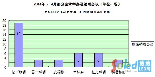 據(jù)不完全統(tǒng)計(jì),2014年2月19日-4月10日,舉行經(jīng)銷商會(huì)議場數(shù)最多的是松下照明開關(guān),共19場,排在第1位;木林森照明與億光LED照明,分別舉行了6場地方經(jīng)性銷商會(huì)議,并列第2位;雷士照明、科思栢麗、史福特照明則分別舉行了3場地方性經(jīng)銷商會(huì)議,并列第3位。