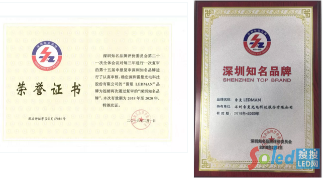 第十五屆“深圳知名品牌”評價活動于2017年3月28日正式啟動, 2018年1月19日,深圳知名品牌評價委員會對第十五屆“深圳知名品牌”評價活動,完成企業(yè)申報、企業(yè)內(nèi)部管理體系現(xiàn)場評審、社會公眾投票、行業(yè)專家評價和品牌價值評估工作,評價委全體會議進行了審議評選。經(jīng)深圳市公證處現(xiàn)場公證,確定認定和入選了8個品牌為第四屆“國際信譽品牌”, 56個品牌為第十五屆“深圳知名品牌”,169個品牌通過深圳知名品牌復評。深圳雷曼光電科技股份有限公司“雷曼 LEDMAN”品牌為連續(xù)兩次通過復審的“深圳知名品牌”。