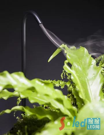 LED面板燈以及較大的容器,同時(shí)以相當(dāng)慢的速度不停旋轉(zhuǎn)。這樣就保證了植物的所有部分都能夠接收到相同的光照量。此外,配備了超聲波空氣加濕器,用來增加植物周圍的空氣濕度。