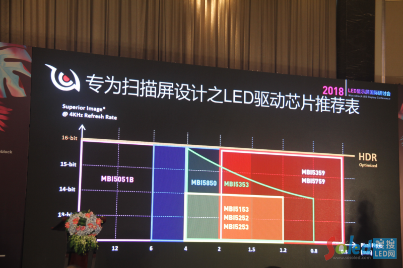 在類似于電影院這樣的低暗環(huán)境,如果喪失了色彩深度,則畫面可能失真。陳企凱先生指出,為解決這些難題,市場上有各種各樣的解決方案,但這些解決方案可能只是關(guān)注某一點,比如提高刷新率部分,或者灰階部分,可能犧牲掉它的刷新率,滿足低灰。而聚積推出的高集成驅(qū)動芯片,把這些都兼顧了。在研討會上,聚積向我們展示了行業(yè)最高標的 HDR-Optimized 產(chǎn)品。該顯示產(chǎn)品使用了聚積MBI5359驅(qū)動芯片,不僅僅是為了實現(xiàn)HDR,而是以目前業(yè)界最高標準HDR-Optimized(16-bit@4KHz)提升顯示效果,透過16-bit的灰階輸出來表現(xiàn)HDR視頻源(10-bit),可以保留更多的畫面細節(jié)以及更好地表現(xiàn)HDR視頻源的逼真與震撼。通過顯示規(guī)格(輸入:SDR(8位) ;輸出:14位@ 4KHz)對比HDR-Optimized (輸入:HDR(10位);輸出:16位@4KHz),我們可以輕易看出SDR與HDR10的明顯差異。
