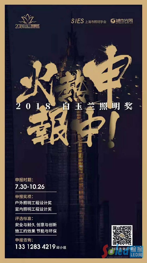 據(jù)悉,2018白玉蘭照明獎的作品征集工作將于10月26日截至,有意向的工程設(shè)計單位可向獎項承辦方軒智傳媒咨詢申報工作。