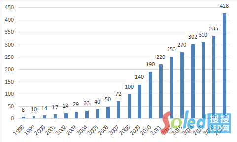圖1所示是我國的LED顯示應用市場從1998-2017年間的銷售增長變化情況。(單位:億元人民幣。)