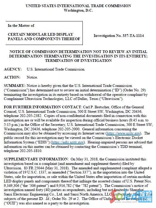 美國(guó)國(guó)際貿(mào)易委員會(huì)(ITC)發(fā)布公告稱,對(duì)涉華特定模塊化LED顯示面板及其組件作出337調(diào)查部分終裁:對(duì)本案行政法官于2019年1月31日作出的初裁(Order No.29)不予復(fù)審,即基于申請(qǐng)方提出的撤回申請(qǐng),整體終止本案調(diào)查。