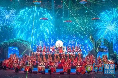 在以往炫酷的大型舞臺(tái)上我們看到的更多的是各種新異LED顯示屏在舞臺(tái)表現(xiàn)中擔(dān)當(dāng)重任。如北京世園會(huì)的地磚屏、升降結(jié)構(gòu)屏、背景網(wǎng)屏、曲面屏、空中矩陣隱形LED屏幕,還有“杭州時(shí)間”的LED智能舞屏,北京八分鐘的冰屏。但在此次耗費(fèi)巨資打造的長(zhǎng)隆劇院舞臺(tái)中,擔(dān)當(dāng)重任的卻是普通的LED顯示大屏。