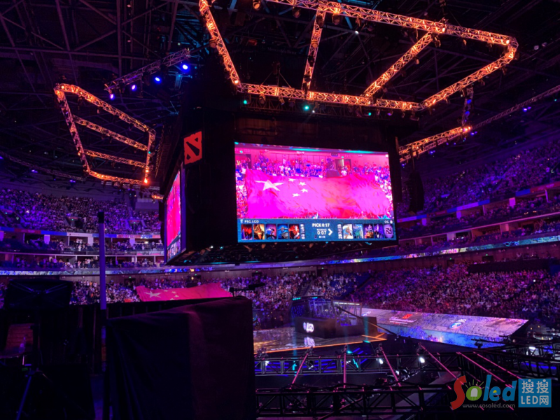 DOTA Ti9中心舞臺(tái)四周懸掛的LED顯示屏