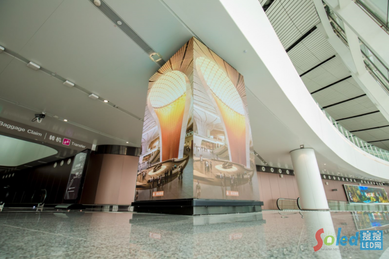 另二個四面環(huán)繞的LED包柱屏位于國際抵達區(qū)主干道,天然獨特視覺,強勢吸睛,90度直角無縫拼接工藝,播放內(nèi)容可360度無死角輻射來往人群,極具創(chuàng)意的形式為展示內(nèi)容賦予震撼力量。