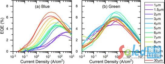 Micro LED的外量子效率(EQE)通常會(huì)隨著尺寸縮小而降低,這成為Micro LED技術(shù)開(kāi)發(fā)的一個(gè)難題。為了進(jìn)一步了解外量子效率與芯片尺寸之間的關(guān)系,首爾偉傲世的一個(gè)研究小組與USCB聚焦尺寸小至1μm的Micro LED,對(duì)比藍(lán)色和綠色I(xiàn)nGaN Micro LED外量子效率的變化趨勢(shì)。
